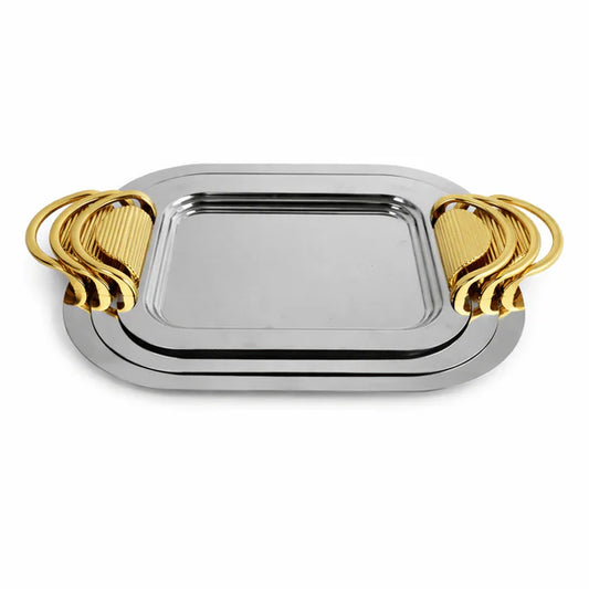 الخامة: مطلي بالفضة اللون: ذهبي بلد المنشأ: الصين المكونات: صينية كبيرة: ٥٣×٣٧ سمصينية متوسطة: ٤٨×٣٢...