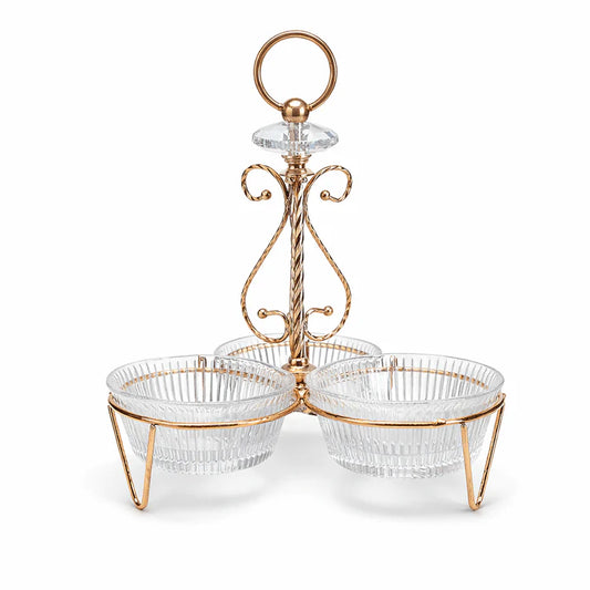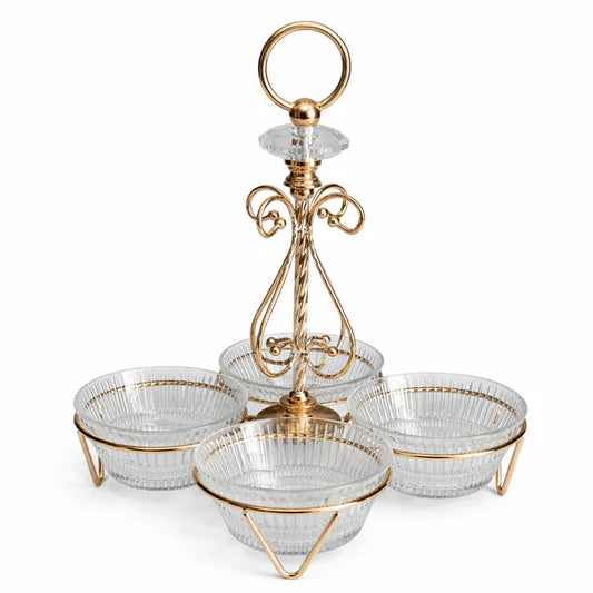 الخامة: زجاج و معدن اللون: ذهبي بلد المنشأ: الصين المكونات: ٤ أوعية ١١ سم١ حامل...
