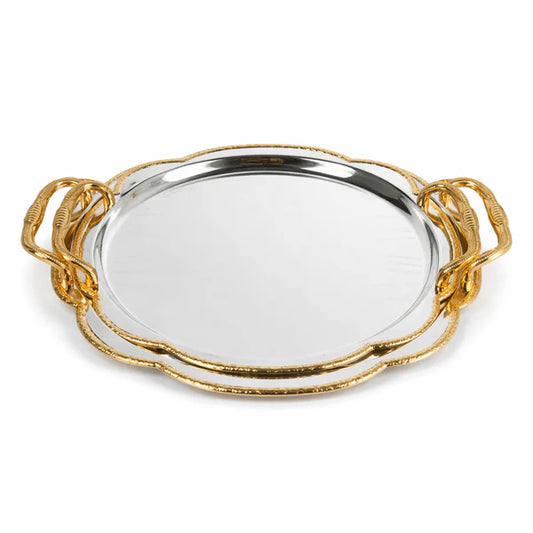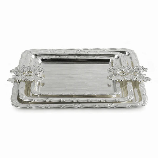 الخامة: مطلي بالفضة اللون: ذهبي بلد المنشأ: الصين المكونات: صينية كبيرة: ٥٣×٣٧ سمصينية متوسطة: ٤٨×٣٢...